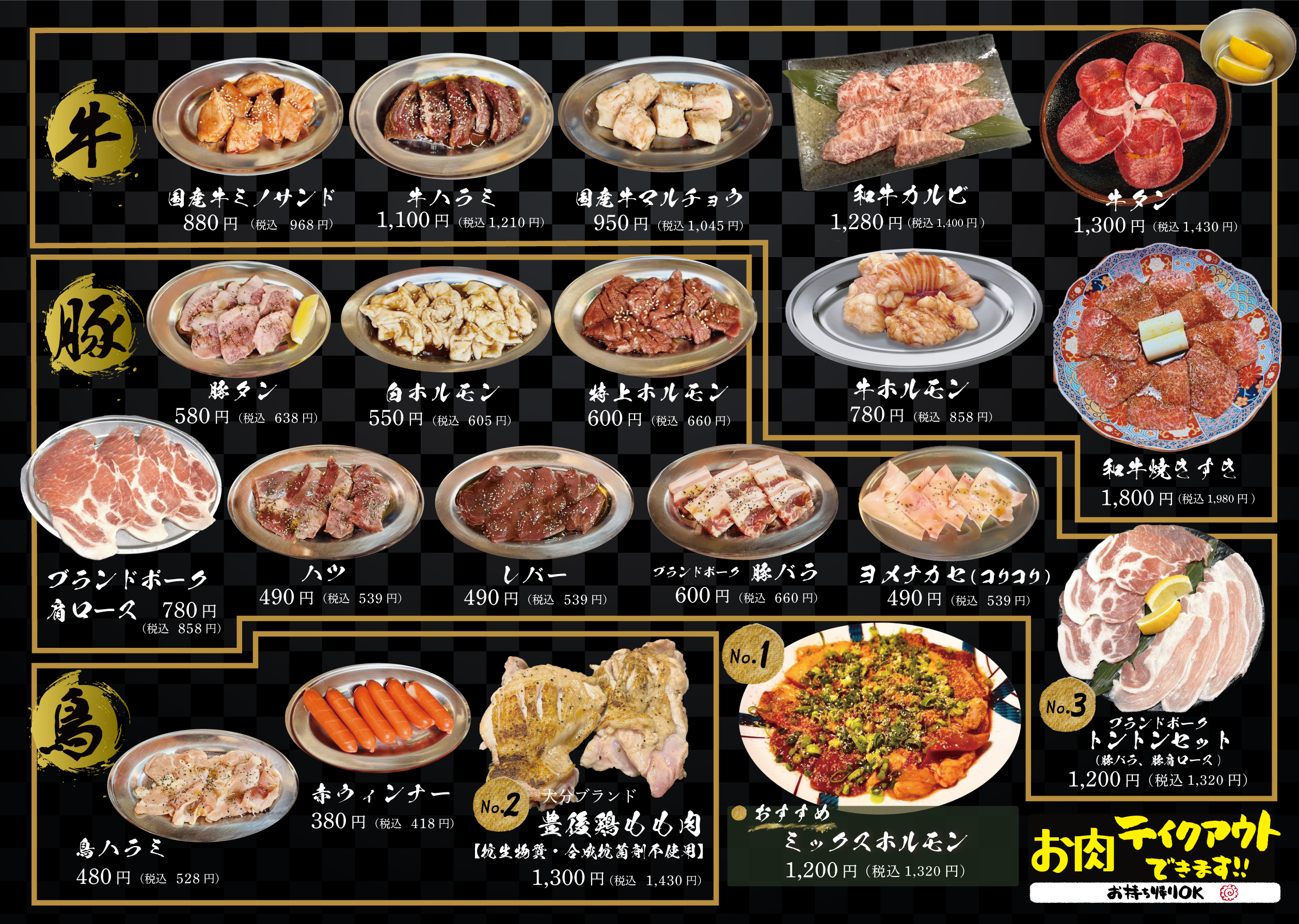 テイクアウトの際は、以下のメニューを参照いただき、メニュー名と数量をお伝えください。金額はテイクアウトのため、以下のメニューの税額10%ではなく税額8%になります。